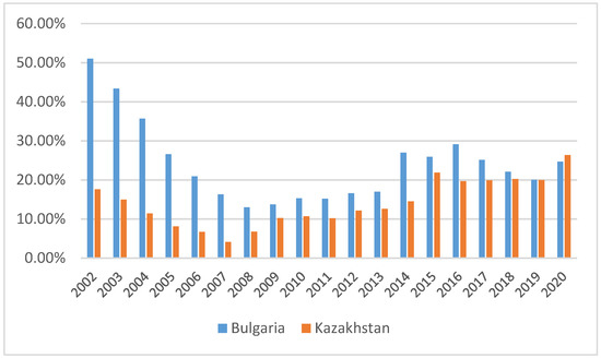 Figure 5 illustrates the dynamics in the development of the Government debt (percentage of GDP) indicator in Bulgaria and Kazakhstan. Here we also see a similar variation of the indicator for the last decade and almost identical values in the two countries for the last three years.