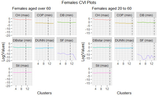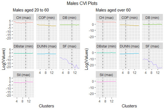 Visually, Figure 1 and Figure 2 were the representation of the outcomes distinguished by the black vertical broken line signifying the optimal cluster points. They show that some validation indices performed abnormally. For instance, the Score Function (SF) chose cluster 2 as the best cluster representation for all ages and gender, but it was not an optimum choice compared to the rest of the indices. The probable reason might be that the Score Function index works well with hyper spheroid data structures and not time series, as Saitta et al. (2007) investigated.