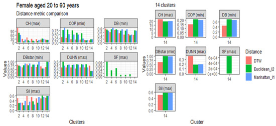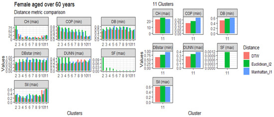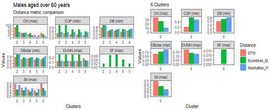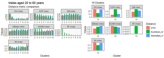 This section presents the results of the proposed modified DTW approach in comparison to the Euclidean (l1 norm) and the Manhattan (l2 norm) distance metrics, referred to in Table 1, based on age, gender, and clusters. The comparisons are represented in Figure 3, Figure 4, Figure 5 and Figure 6. Generally, the DTW has shown superior performance based on the seven validity indices outlined in Table 3. For males aged 20 to 60 and over 60 years, six out of the seven indices identified DTW as the best distance metric. Similarly, females aged 20 to 60 had five out of the seven supporting the DTW. However, DTW and the Euclidean distance jointly lead with three out of seven indices among females aged over 60, with Manhattan only scoring the best under the Dunn index. Despite the results among older females, these results suggest that the DTW distance metric is the best performing model and is suitable for detecting optimal clusters in temporal datasets. Studies of Bartkowiak et al. (2018) have confirmed that the performance accuracy of DTW measures on smaller datasets are better than the lock-step measures, which include both the Euclidean and Manhattan distance criteria because of the dilating alignments of the warping window with time. Furthermore, Cassisi et al. (2012) demonstrated that the Euclidean distance was limited because it could only compare observations with similar lengths, unlike DTW, which could incorporate varying series lengths. DTW overcomes the one to one comparison by achieving the many to one comparisons. It shows that the DTW accepts various alignments of the series datasets because it is less sensitive to non-uniform amplitude scaling and captures structural distortions among non-linear datasets.