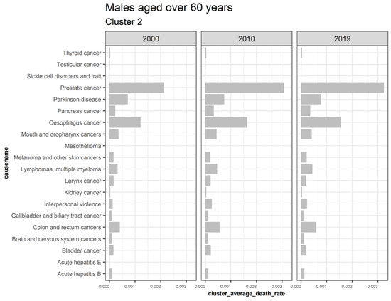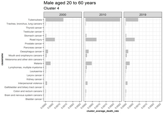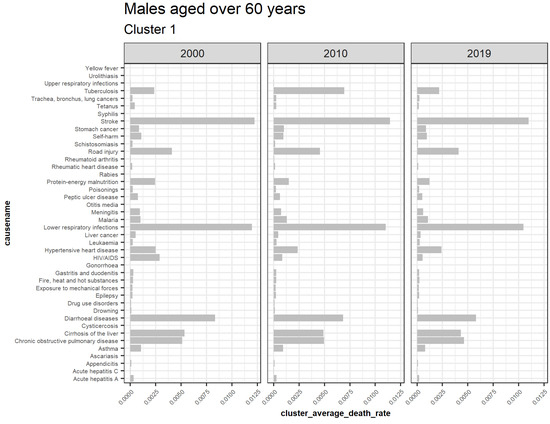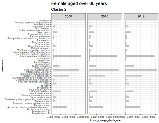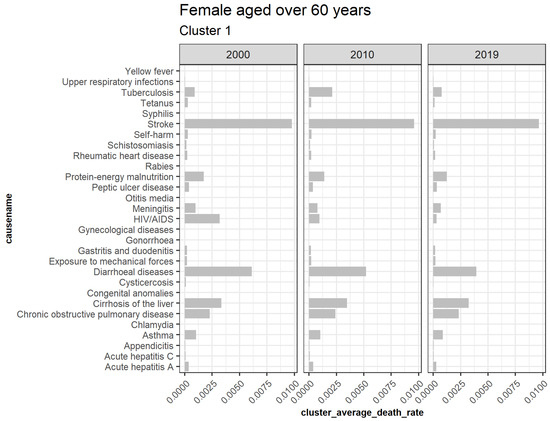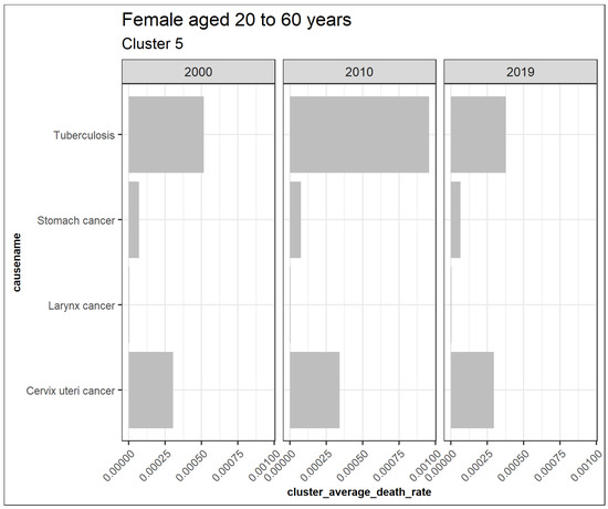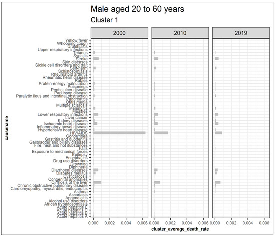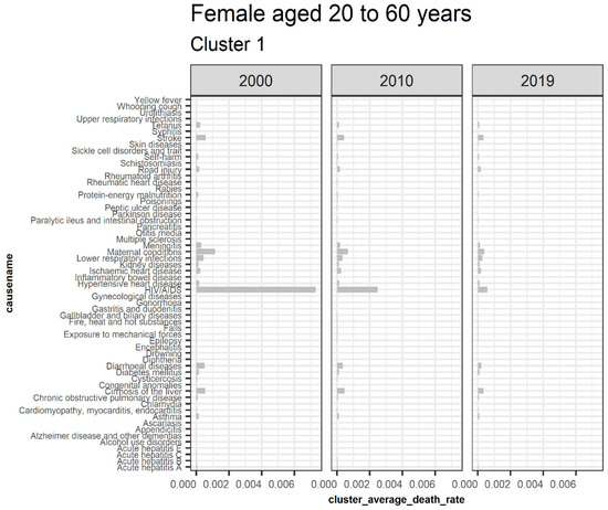 Figure 7 illustrates extracted clusters in younger females. Cluster 4 represents upward trending causes, while clusters 1 and 5 are declining. Cluster 2, 5, 6, 7, 8, 9, 10, 11, 12, 13, and 14 are outliers. Cluster 3 represents the insignificant causes. Figure 8 displays the average death rates of the causes of death in cluster 1 among females aged 20 to 60 years partitioned in 2000, 2010, and 2019. The average death rates are generally declining over time. HIV/AIDS is shown to experience the most significant reduction in causing deaths compared to other causes. Maternal conditions, tetanus, stroke, meningitis, lower respiratory infections, diarrheal diseases, and cirrhosis of the liver are also shown to be fairly significant.