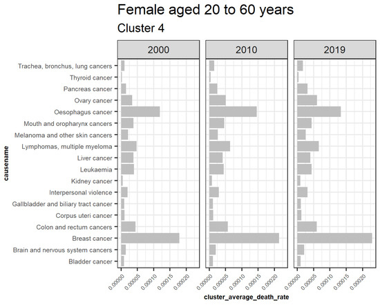 This result demonstrates that HIV/AIDS is a declining trend among females aged 20 to 60 years, as shown in cluster 1. Detection of the other declining causes of death that form cluster 1 in females 20 to 60 are also achieved and can be quantified based on their decreasing rates in the short run. Figure 9 also represents the declining trend of the average death rates of the causes in cluster 5 among females aged 20 to 60 years. Tuberculosis, cervix uteri cancer, stomach cancer, and larynx cancer have experienced a general decline despite a trend break scenario, meaning that their trends did not consistently reduce from the year 2000 to 2019, as shown. This result explains one of the shortcomings of using this approach in monitoring one-directional trends. Figure 10 represents the average death rates of the causes of death in cluster 4 among females aged 20 to 60 years partitioned in 2000, 2010, and 2019. Notably, all the increasing causes in this cluster are cancer. Breast and esophagus cancers have significantly increased, while thyroid cancer has the least. This result implies that cancers are increasingly the leading cause of death among females aged 20 to 60. Similar studies such as (Mahase 2019) suggest that cancer will be the most prevalent cause of death not only in high-income countries but also globally. Furthermore, Hamdi et al. (2021) have specifically identified esophagus cancer as the leading cancer cause of death in Kenya and its region, as confirmed by these results.