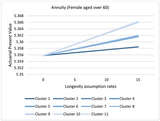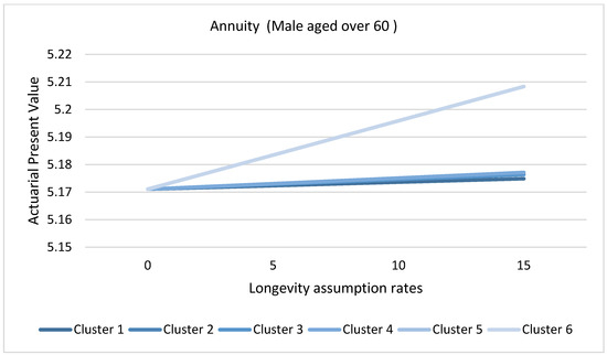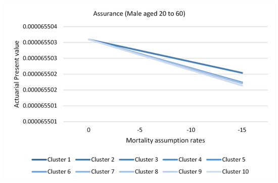 According to the prevailing government bond yields, a basis of 13% per annum effective rate will be applied. This rate reflects the interest rate risk for Kenya. A 10-year window period assumes that historical trends will continue like the current mortality rates. The achieved clusters’ behavior regarding the overall mortality will be monitored and observed based on the different values of the mortality shocks, for 0, ±5%, ±10%, and ±15%. The motivation of this scenario-based approach is also to incorporate the usage of ±10% rate of mortality shock recommended by legislation in Kenya (Insurance Regulatory Authority 2017). The influence of eliminating a cluster in the age group and gender will be quantified and assessed in conjunction with the derived Actuarial Present Values (APV) and assumption rates using visualization techniques.