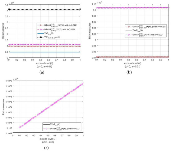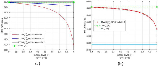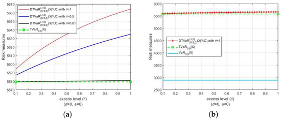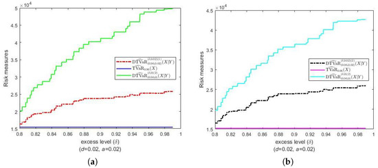 Lethave a Pareto distribution with parameters and , i.e., . Let Y be another Pareto random loss that also has a Pareto distribution and associates with . Both Figure 1 and Figure 2 present the DTVaR estimates for various FGM copula parameters and , along with the TVaR estimates. Consider the bivariate losses . For each couple , we set , and , respectively (see Figure 1a). The selection of parameters corresponds, respectively, to the strong, medium and weak dependences. In Figure 1a, the comparison of the riskiness of and is presented. Notice that the risk measures of the TVaR of at level α are the same in the three cases. Furthermore, note that DTVaR coincides with TVaR in the independence case (), whereas DTVaR is exactly the same as CTVaR when . The DTVaR of the loss is higher than those of and , respectively, i.e., is riskier than and In Figure 1b, it is shown that both DTVaR and TVaR of are located above the VaR of for the same probability level α. We can see that the DTVaR estimates are always larger than the TVaR estimates when the copula parameters are positive, whereas the DTVaR estimates are always smaller than the TVaR estimates when the opposite occurs (see Figure 2). Therefore, these results are in accordance with the statement (21) and its reverse.