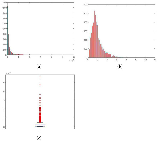 Table 1 provides summary statistics on the claim amount and vehicle value. We can find that both the claim amount and vehicle value have positive skewness, namely 5.0470 and 1.8614, respectively. Moreover, the respective kurtosis of the claim amount and vehicle value is significant when higher than 3. Kurtosis values above 3 (43.3102 and 9.9344) indicate that, relative to a normal distribution, more probability tends to be at points away from the mean than at points near the mean. This is confirmed by Figure 3. Moreover, Figure 3c shows the box plot of the data of the claim amount, depicting that there are 758 outliers in the right tail.