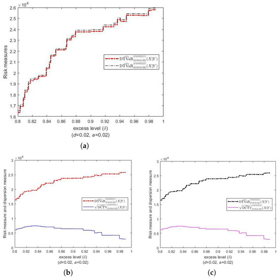 In Figure 5, we can see that the estimates of DTVaR are relatively larger than those of TVaR. Those relatively large DTVaR estimates are highly probably influenced by the number of outliers (758 observations). In Figure 6a, it can be seen that both first and second estimates of DTVaR relatively nearly coincide. Furthermore, we can see in Figure 6b,c that both first and second estimates of DTVaR are larger than the corresponding estimates of DCTV.
