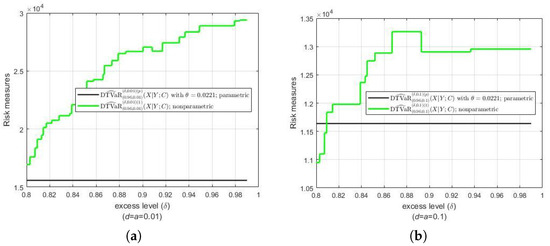 Figure 7 presents two different results regarding the difference between the parametric estimates of the DTVaR and its nonparametric estimates. When the contraction parameter , we can see in Figure 7a that the differences between the two are relatively large, and even very large for values approaching 1. However, for , the differences between the two estimates are relatively small (see Figure 7b).