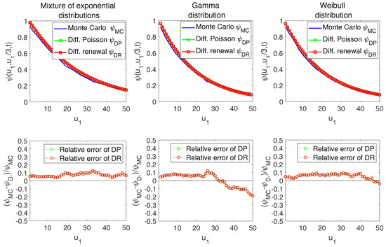 Ruin probabilities (top panels) for the insurer–reinsurer model in the finite-time horizon calculated using Monte Carlo (MC) simulations with the renewal process with , , the diffusion approximation with the Poisson process (DP) with and the diffusion approximation with the renewal process (DR) for selected light-tailed distributions. Respective relative errors (bottom panels) of the approximations. In the simulations , number of MC iterations is 10,000, parameters of claim distributions are given by Equations (18)–(20).