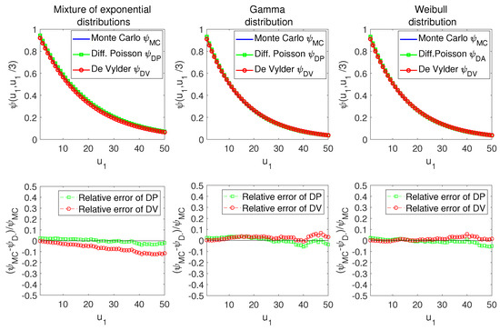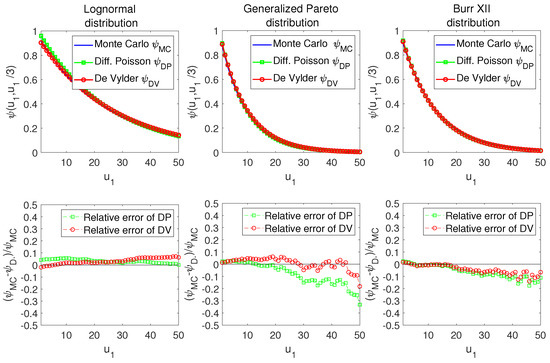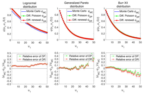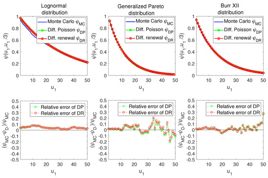 In our last analyses presented in Figure 5 and Figure 6 we simulate the Poisson process with ) and compare the diffusion approximation for the Poisson process with the so-called De Vylder-type approximation Burnecki et al. (2019). We can observe clearly that in all cases, for the log-normal, mixture of exponential and gamma distributions, the diffusion approximation leads to smaller relative errors. In the case of the Weibull distribution, both approximations give comparable results. For larger initial capital and the generalized Pareto and Burr XII distributions, the De Vylder-type approximation outperforms the diffusion approximation.