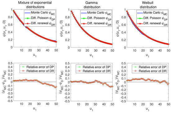 Ruin probabilities (top panels) for the insurer–reinsurer model in the infinite-time horizon calculated using Monte Carlo (MC) simulations with the renewal process with , , the diffusion approximation with the Poisson process (DP) with and the diffusion approximation with the renewal process (DR) for selected light-tailed distributions. Respective relative errors (bottom panels) of the approximations. In the simulations, the number of MC iterations is 10,000, parameters of claim distributions are given by Equations (18)–(20).