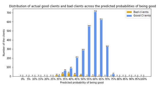 In Figure 2, the predicted “bad customers” are to be found mainly in the interval [25%, 50%], and there are no “bad customers” beyond a predicted default of 70%. The predicted “good customers” occur in the interval [45%, 75%]. We can therefore set the predicted probability interval [0%, 70%] as “uncertain”. Figure 2 suggests that the prediction performance might potentially be improved via the use of a graphic distribution. This is our focus in the following section.