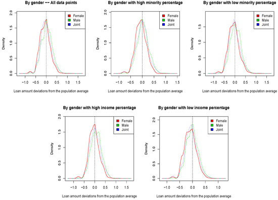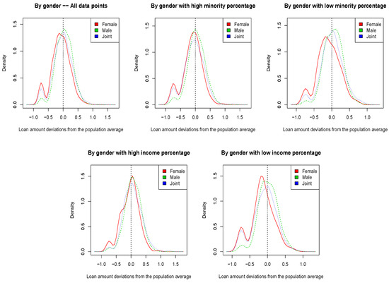ME loan amount deviations from the population mean based on full data and sub-populations with low/high minority and low/high income percentages.