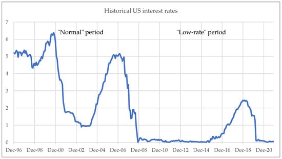 Hartley et al. (2016) classified interest rates into “normal” and “low-rate” periods (Figure 1). Between 2002 and mid-June 2007—a “normal” period—small changes in interest rates did not affect insurers’ stock prices in the US and the United Kingdom (UK). Interest rates were within their historical norm. However, after the 2007–2008 financial crisis, the long-term interest rate drastically decreased, leveled off at a historically low level, and has stayed at that low rate since then (Hartley et al. 2016). Reyna et al. (2022) emphasized that insurers must implement specific actions to recover their profit margins after a period of persistently low interest rates.