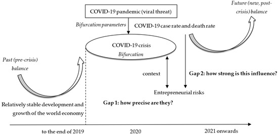 Figure 1). The COVID-19 crisis is treated as a new context that formed under the influence of the pandemic. In this new context, the entrepreneurial risks grew, but it is unclear to which extent (gap # 1) and what influence the factors of the pandemic—the COVID-19 case rate and mortality—had on them (gap # 2). These gaps cause uncertainty and hinder the establishment of the future (new, post-crisis) balance of the world economy. Thus, they must be filled in.