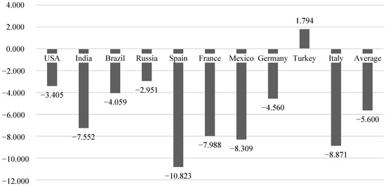 Table A10. Firstly, calculations for each country in isolation are performed. Then, the data are enlarged, and a general table of data is formed which reflects the situation in international entrepreneurship amid the COVID-19 pandemic and crisis. The result of this task is the determination of the entrepreneurial risks: characteristics that were aggravated in 2020 compared to 2019 (for which TG < 0).