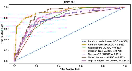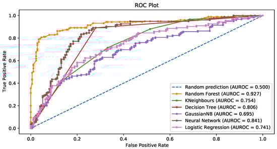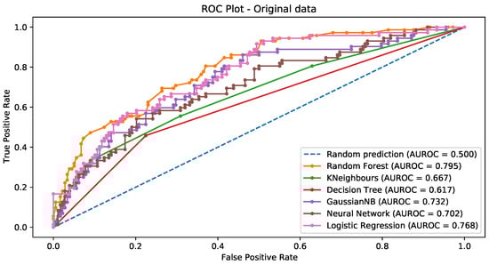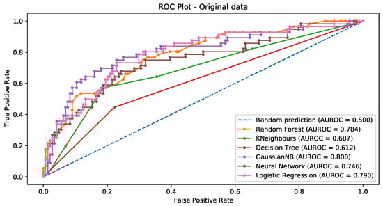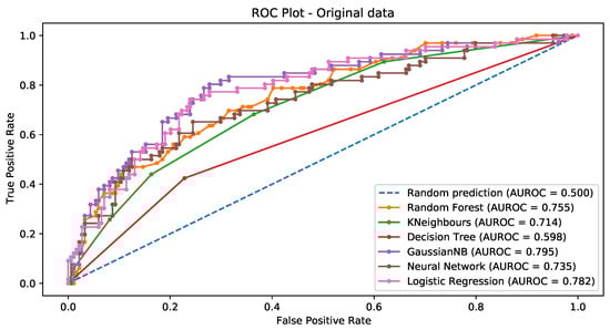 Figure 11, Figure 12, Figure 13 and Figure 14 show the ROC curves for the original data (Figure 11) and the data balanced via the SMOTE, SMOTEtomek, and random oversampling, respectively (Figure 12, Figure 13 and Figure 14). Each plot displays the ROC curves corresponding to all the classification techniques employed.
