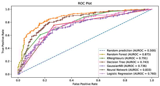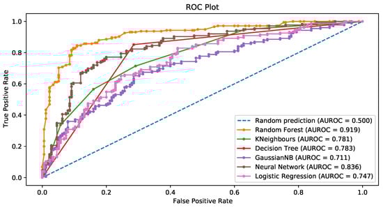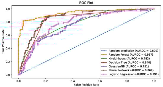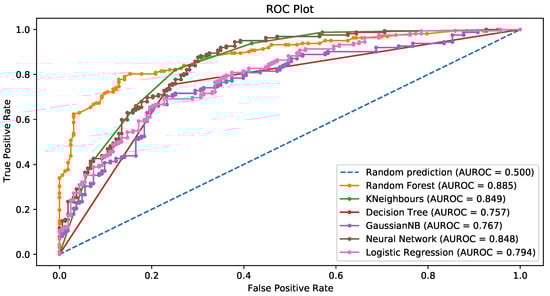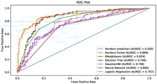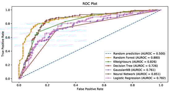 For random forests, the number of trees in the forest was 100. The mean decrease in the Gini index was the measure of the quality of a split in both random forests and decision trees. In the Naïve Bayes approach, the prior probability of each class, (), was estimated via the relative frequency of the training data in the kth class. As for the univariate distributions of the predictors, they were assumed to be Gaussian in the continuous case, whereas standard nonparametric estimates were used for categorical densities (see, for example, ). The KNN algorithm employed a number of neighbors 3. In neural networks, the activation function for the hidden layer is a rectified linear unit (ReLU). Finally, in regularized logistic regression, the norm of the penalty was 4.