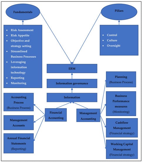 RM is a feature of an enterprise’s life in all different forms of enterprises, whether it is listed or unlisted (). According to (), it is not a coincidence that attention has been paid to the role of MA in RM. The increased focus on RM stems from the importance of CG, detecting, measuring, treating, and observing risk, and the competence of management controls (). RM should be approached from a holistic perspective, as risk affects each aspect of the enterprise (). () directly links the position of MA to RM. In agreement, () emphasise the proactive role of management accountants in connecting and collaborating risk control. Therefore, there is an emphasis on MA in RM. It might be essential for SMEs to start appreciating this connection. As such, MA, under the umbrella of accounting information, is considered an important component of information governance that leads to ERM.