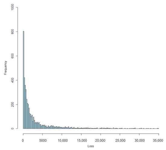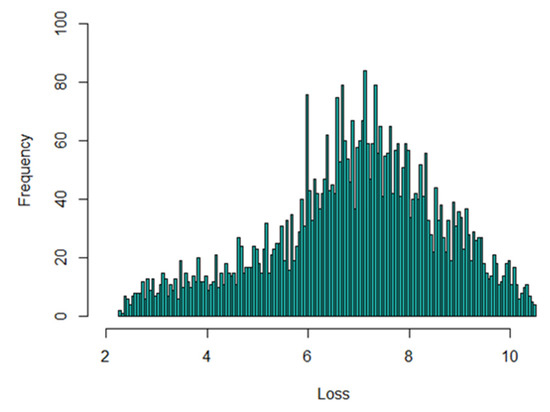 The data set used to calculate model premiums introduced in this paper was based on 1-year automobile insurance policies taken out in 2004 or 2005. This data set can be found on the website of the Faculty of Business and Economics, Macquarie University (Sydney, Australia), see also De Jong and Heller (2008). Out of 67,856 policies in the total portfolio, 4624 claims were made. Histograms of the data set and histograms in log scale are shown in Figure 2 and Figure 3, respectively. There were 4333 policyholders who made claims once, 271 twice, 18 three times and 2 four times. The limit value was taken as 500 monetary units, and data were derived from Déniz (2016) to distinguish between the two types of claims. The number of policyholders that made claims once with claim size above the limit value was 2615, 123 twice, 7 three times and 1 four times, as shown in Table 1.