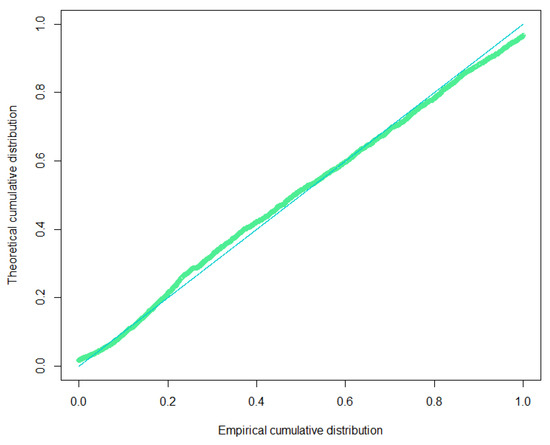 The results gave the maximum likelihood estimators 1501.5620 and 0.8012, with D-value = 0.0339 and AIC = 82,083.9448. Figure 4 shows the P-P plot of the Gamma-Lindley distribution.
