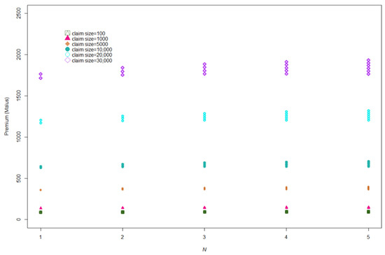 From the results in Table 3, a bonus with no claims in the first year represented 6.77% of the base premium. Policyholders who made one claim with a claim size below and above the limit value during the first year must pay a malus at 82.92% and 87.97%, respectively of the base premium. Premiums decrease if policyholders have a claim-free year and increase if claims occur. The Bayesian bonus-malus premiums achieved under the traditional Poisson-Lindley model were compared (see Moumeesri et al. 2020 for details). The bonus-malus premiums were the same as the bonus ( 0) and different for the remainder of the malus (). For these malus classes, policyholders with a claim size below the limit value are rewarded compared to those with premiums determined under the traditional Poisson-Lindley model. The remaining premiums may be larger or smaller than those obtained in this model. A comparison of premiums between the traditional Poisson-Lindley model and the proposed Poisson binomial-Lindley beta model in the first year for various numbers of claims is shown in Figure 5.