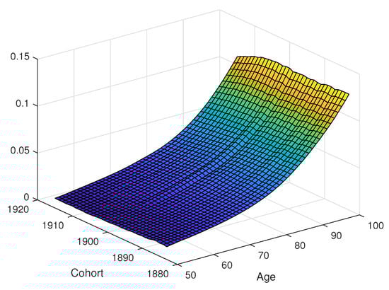 We consider a single cohort so that the subscript x indicates the age of the cohort at time t and individuals age as time increases in the cohort. We will later fix the initial age of a cohort at 50 for cohorts with birth years ranging from 1883 to 1915, and the age-cohort mortality rates for each cohort will be from ages 50 to 100. The historical age-cohort mortality rates are single-cohort curves differing by the birth year of the cohort.