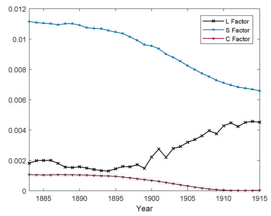 The independent Blackburn–Sherris model factor loadings all have the same functional form but differ in the values of the fitted . This parameter results in different factor impacts across ages for the cohort mortality curve. The independent AFNS model’s factor loadings have direct interpretation. , the level factor, is constant, so it has the same impact on all ages in the cohort mortality curve. , the slope factor, is increasing, so it impacts mortality rates at older ages more than at younger ages, resulting in changes in slope. , the curvature factor, is decreasing and, along with the other factors, produces curvature in the dynamics of the survival curve through time.