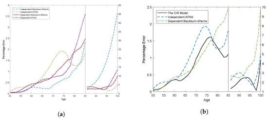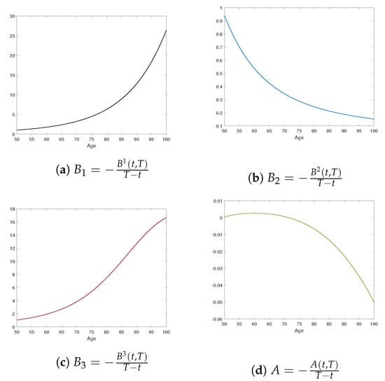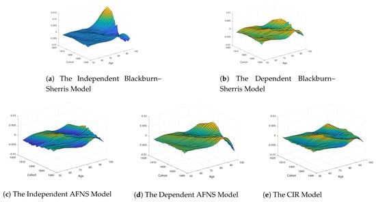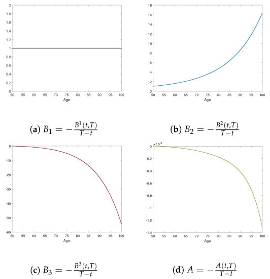 The factor loadings and for the dependent Blackburn–Sherris model are provided in Appendix A. For the dependent AFNS model, the factor loadings are the same as for the independent factor model and an explicit expression for is given in Christensen et al. (2011).