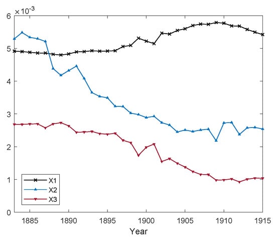 All the long-term mean parameters in the CIR model are positive. This ensures the factors are positive and positive mortality rates in the model. The second factor, , has the largest mean reversion speed, , and largest volatility, . This factor has more impact on the short term (Geyer and Pichler 1999). The mean reversion rate and the volatility of are lowest, compared with the other two factors, so the first factor has less impact on mortality dynamics and is less volatile.