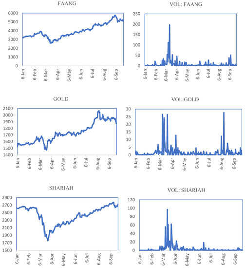 The Autogressive Conditional Heteroscedasticity (ARCH) process presented by Engle (1982) and the generalized ARCH (GARCH) process introduced by Bollerslev (1986) are considered the standard methods to model the volatility of stock returns in a univariate setting. However, to investigate the volatility spillovers among different classes of assets, a multivariate GARCH procedure is preferred. As a first attempt, Bollerslev et al. (1988), among others, proposed a diagonal VECH method to study the conditional covariances in the bond and stock market in the USA; however, the model failed to ensure the positive definiteness of the conditional variance matrix, which is one of the requirements to construct a multivariate model. Moreover, the diagonal VECH model was not able to capture the cross-equation effects. A substantial amount of literature has been published around multivariate GARCH models over the last couple of decades. Engle and Kroner (1995) proposed multivariate GARCH–BEKK (Baba, Engle, Kraft, and Kroner) parameterization, which overcame most of the problems inherited in the early models. However, the BEKK model only satisfied the hypothesis of constant correlation instead of the dynamic conditional correlations among different asset classes. Engle (2002) proposed a dynamic conditional correlation coefficient (DCC) model to overcome the BEKK limitations. In this study, we utilized both the GARCH–BEKK and GARCH–DCC model to investigate the volatility spillovers and conditional correlations among FAANG stocks, gold, and sharia-compliant equity.