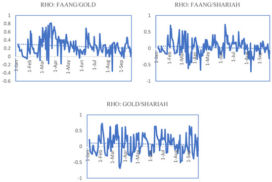 Similar trends were observed in the dynamic correlations between the FAANG stocks and sharia-compliant equity with a peak correlation happening in June 2020 at 72% followed by a significant negative correlation (−70%) in August 2020, indicating the strong protentional of diversification benefits between the two assets. Likewise, the time-varying conditional correlations between gold and shariah-compliant equity showed a similar pattern of negative correlation during the pandemic period. The time series plots generated by the dynamic conditional correlation model in Figure 2 gives further detailed information that supports the hypothesis that the overall correlations between the assets were lowest during the COVID-19 period, emphasizing, the superiority of the DCC model over a constant conditional correlation model.