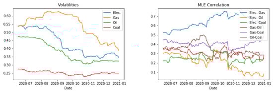 The Figure 1 reports the Maximum Likelihood Estimation (MLE) of the volatility and the correlation of a Geometric Brownian Motion (GBM ()). A rolling window of 100 days is used to evaluate the dependency of these parameters with time.