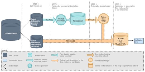 The optimal policy is approximated by a feed-forward neural network, called deep hedger. The model learns the optimal controls which minimise a hedging risk at the terminal value T. The network consists in 3 hidden layers of 10 units each with Relu activation. Adam optimizer is used, with learning rate at 1 × 10. The number of iterations is 10.000 and batch size is 300. There are four deep hedgers as there are four generators, each hedgers being trained on the samples of a generator. During the training, at each iteration of the deep hedger the generators simulate new data. The training set includes 211 historical price sequences of 30 dates on where the different evaluation scores are computed. The four different hedging policies are then tested on unobserved price time series from the historical data set. Figure 3 illustrates the full data-driven methods for risk hedging.