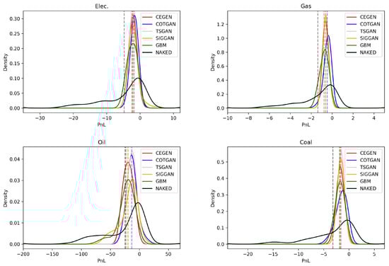 An options trader determines a selling price according to the hedging strategy of the PnL distribution. In order to be attractive in the market, the trader has to offer a low price, slightly higher than the average of the PnL distribution, to make a profit. However, if this distribution is too dispersed, the trader has to cover the risk of big losses by offering a higher price. In the case of fuel, using the GBM or SIGGAN strategies, the trader must not make a mistake by proposing a low price in spite of a significant recentering of the distribution around the average because the tail risk is very high. Another observation is that in all cases below, the vertical lines representing the averages of the different distributions are higher for the hedging strategies than for the naked strategy. However, under the assumption of no arbitrage, the average PnL should be the same when hedging or not. If this looks profitable, especially for the COTGAN whose averages are the highest, it is not necessarily a sign of good performance. On the contrary, it may be because of bad hedging evaluation, but in the context of a bullish market, it may turn to its advantage.
