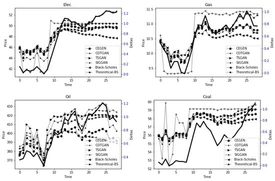 The controls from each model on a single historical price trajectory are illustrated in Figure 5. The policies of CEGEN and SIGGAN are very reactive to the price, and propose similar policy on each option. COTGAN as for it provides low volatility controls on electricity and gas data, in the opposite on oil and fuel the deep hedger seem to follow the price of the commodity. Such instability may question the validity of the policy, and would need further analysis. This is consistent with the Table 1 and the unrealistic smooth curves that did not have significant price fluctuations shown in the Figure 2. In all cases, TSGAN and BS controls are relatively consistent and appear to be unaffected by the price, buying the same amount of asset over time during the period.