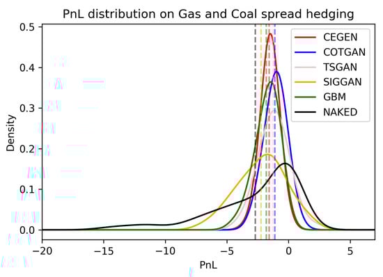A call option on the spread between gas and coal has a payoff . The spread is the price difference between these two commodities, where the strike is the initial spread . As in the previous section, the maturity remains 30 days and the hedge portfolio is rebalanced everyday. Although the success of the hedge still depends heavily on a correct representation of the gas and coal time series individually, this is no longer the only condition for learning a good strategy. Generators must also represent the joint distribution of these prices to correctly train a deep hedger on the spread. In particular, the generators’ appreciation of the historical correlation is crucial to the correct modelling of prices.