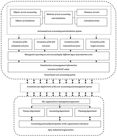 The practice of the adoption of OLAP systems in the economy has spread rapidly among developed countries. In particular, China is moving from the traditional manual audit to the computerized auditing of accounts (). Accounting with a computerized audit information system in an information environment is much more complex than a manual ledger, so static stand-alone audit information systems based on digital copying of financial data are being developed. There emerged the practice of introducing digital twins into such control systems. A digital twin is a real representation of all components in the product lifecycle using physical data, virtual data, and the data of interaction between them (). Research into the opportunities to use digital twins mainly focuses on production objects and processes but also begins to be actively used in business models (). This allows us to propose the use of digital twins in the practice of creating a system of cost management and risk reduction in the agricultural industry. All the more so because the new model of creating a digital product using digital twins significantly reduces the time it takes to enter the market because of the product life cycle (). Therefore, we propose to use this practice in agro-industrial organizations to create a digital copy of the cost management system. Such a copy will be used by the company’s administrative apparatus to make decisions on costs before the actual operation of the system, thereby diagnosing possible risks at an early stage of decision-making.