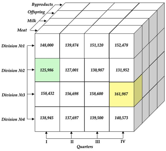For a better understanding of the model, we utilized a four-dimensional OLAP cube. This cube allows management staff to obtain data on the value of the cost price of livestock products with details by product types and divisions included in the agro-industrial enterprise Kurochka in a visualized form. Moreover, the information is presented by quarters of the current fiscal year (Figure 3).
