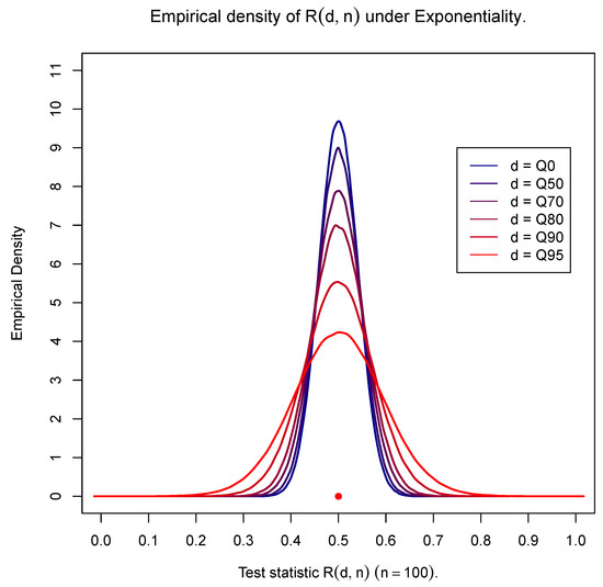 For illustrative purposes, Figure 1, Figure 2 and Figure 3 based on 25,000 simulations provide the empirical density of for the exponential distribution and for representative examples of a light-tailed distribution (Weibull with shape ) and a heavy-tailed distribution (Weibull with shape ) for samples of size and for different values of d. Observe that all figures provide the density for the entire data set (using as a threshold the 0th percentile—) accompanied by the densities for the portion of the data set above the 50th, 70th, 80th, 90th and 95th percentiles (Q50, Q70, Q80, Q90 and Q95). The same behavior is observed for small () as well as for large sample sizes () (results not shown). For the exponential distribution, observe that the general shape of the density of is not affected by the value of d and is in fact symmetric and centered at , which confirms that (7) holds true for any value of d. At the same time, the variability varies for different sample sizes, being larger than the one depicted in Figure 1 for small sample sizes () and smaller for larger sample sizes ().