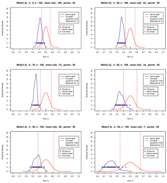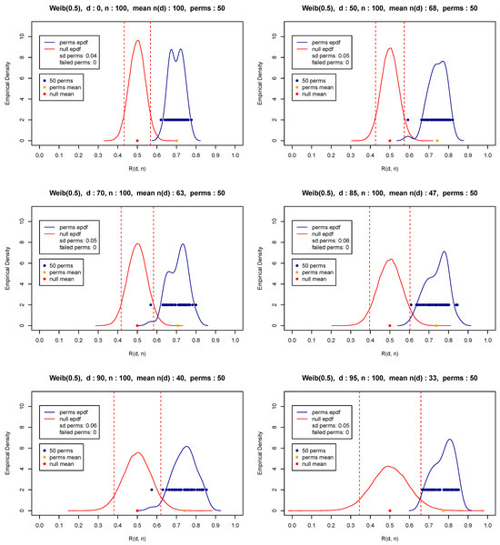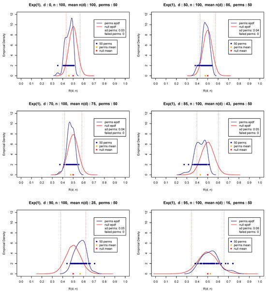 In what follows, we have chosen to perform 50 permutations, which is a number that appears to be more than satisfactory for practical purposes. In fact, our extended simulations show that any number of permutations at least equal to 50 gives a distribution with sufficient speed (insignificant computational cost) and a very small variability. At the same time, the execution of at least some permutations is highly recommended so that a balance or compromise is materialized to overcome possible sequential dependencies and diminish influential pairings. Figure 4, Figure 5 and Figure 6 present the distribution of for various thresholds based on 50 permutations (blue points and blue curve) of random samples of size from the exponential distribution with parameter values equal to 1 (Figure 4) and representative light and heavy-tailed distributions (Weibull with shape and 0.5—Figure 5 and Figure 6). The figures also show the mean (orange bullet) and the standard deviation of the 50 repetitions (denoted by sd perms) of the test statistic as well as the mean (red bullet) and the empirical pdf of the test statistic (red curve) under the null hypothesis in (8) and (9). Observe that these results reconfirm the theoretical results appearing in (5)–(7).