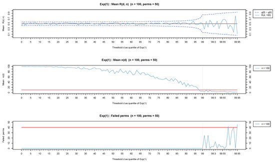 Observe that in all three cases but mostly for light-tailed distributions, the test statistic exhibits a fluctuation for large values of d which is due to a small number of available observations. The values for each threshold d are provided in the middle part of each figure, showing clearly that for any distribution but mostly for light-tailed ones, as the sample size decreases (from to ), there are veryfew observations left for the analysis. Extensive simulations have shown that (represented by a red horizontal line in the middle part of Figure 7, Figure 8 and Figure 9) is a reasonable minimum number of observations for reliable inferences. Observe that stays over the red horizontal line for all d values for heavy-tailed distributions (middle part of Figure 8) but crosses the red horizontal line for depending on n for light-tailed distributions (middle part of Figure 9) as well as for the exponential case but for a higher threshold (middle part of Figure 7).