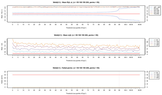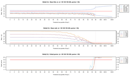 Figure 7, Figure 8 and Figure 9 show representative results based on the Weibull distribution with shape values ranging from 0.1 (for a representative heavy-tailed distribution) to 1 (for the exponential distribution) and up to 1.9 (for a representative light-tailed distribution). Observe that the values remain in the vicinity of 0.5 (top-part of Figure 7) for the exponential distribution irrespectively of the value of the threshold d. On the other hand, the test statistic stays away from and more specifically over (toward 1) for heavy-tailed distributions (see the top part of Figure 8) and under (toward 0) for light-tailed distributions (see top part of Figure 9).