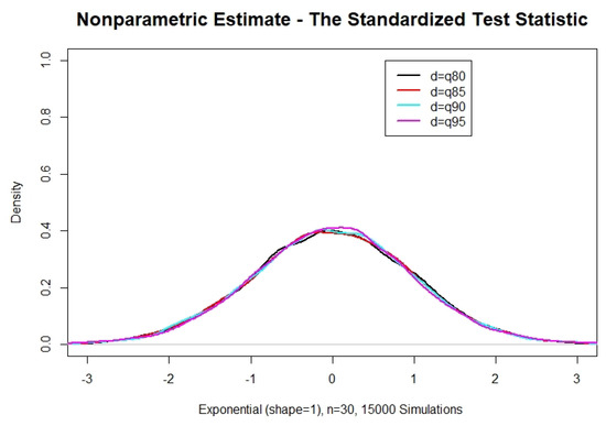 On the other hand, Figure 2 and Figure 3 fully confirm expressions (5) and (6). Indeed, it is observed that as d increases (and the number of available data decreases), the limiting result in (5) is evident. One additional observation for the heavy-tailed case is the smaller variability as compared with the one observed for the light-tailed case as d increases. At the same time, as the threshold d tends to zero (including the case of the full data set), the distinction between the exponentiality and light- or heavy-tailed distributions becomes difficult. This is the reason classical tests, i.e., tests based on the entire data sets, are not always able to distinguish between exponential and non-exponential distributions. The test to be proposed below is resolving this matter by providing a tail test which manages to make the distinction and identify correctly the underlying distribution by examining solely the tail part over the threshold d.