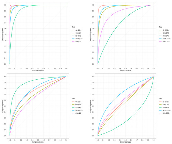 Since the size of each test differs from the targeted nominal one, we have decided to proceed further with the comparison of the tests in terms of power, making some necessary adjustments. For this purpose, we rely on the Lloyd method (Lloyd 2005; Jimenez-Gamero and Batsidis 2017), which is based on receiver operating characteristic (ROC) curves. Consider the reliability (or survival) function of a continuous random variable X and let represent the critical value for the nominal value . Then, ROC curves can be constructed by plotting the power against the size for various values.