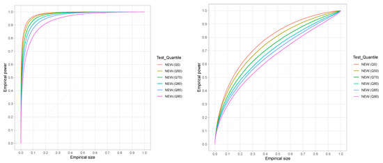 Figure 12 provides the ROC curves for the new test for with six different thresholds including the entire data set (Q0). The left part of the figure refers to data from the Weibull distribution with shape = 1.5, while the right part refers to data from the Gamma distribution with a shape parameter taken to be equal to 0.8. The two cases cover log-convex as well as log-concave random variables with one chosen to be relatively close to the exponential distribution (Gamma with shape = 0.8) and the other slightly further away (Weibull shape = 1.5). Similar results have been obtained (results not shown) for different shape parameters ranging from to and from to for both the Gamma and the Weibull distributions with analogous results. Note further that although the results presented for both the size and power involve samples of size 100, the same results have been established for smaller samples sizes (), but due to space limitations, they cannot all be included in the manuscript. Note that the results for the Gamma case are not as exceptional as the ones for the Weibull case, but the proposed test is quite satisfactory as compared to other competitive tests, as Figure 11 shows.