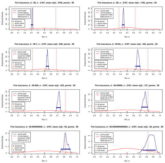 In this section, we wish to apply the proposed methodology to the Fire Insurance Danish data (Pfaff et al. 2012) with and show that the underlying distribution is a heavy-tailed one, which will be done based on Theorem 1. For illustrative purposes, the 50 values of the statistic given in (10) for permutations and various d values are presented in Figure 13 (blue bullets). The test statistic given in (12) is also depicted in the same figure (orange bullet).