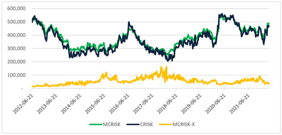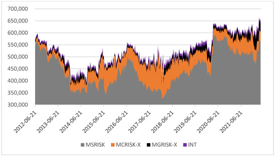 We apply our multifactor risk framework to a sample comprising large Eurozone banks in the July 2011–April 2022 period. To the best of our knowledge, this is the first attempt to simultaneously analyze the effect of the three macro risks of interest (systemic, climate, and geopolitical) with the aim of quantifying and attributing tail risk. Given the multivariate nature of this context, we now identify systemic risk as MSRISK (corresponding to the shortfall ), climate risk as MCRISK (), and geopolitical risk as MGRISK () to differentiate these estimates from their bivariate specifications, whereas MCRISK-X, MGRISK-X, and INT denote the parts of tail risk attributable to climate, geopolitical, and interaction risk, respectively.