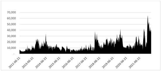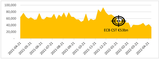 Secondly, during the period considered, these 10 banks were always among the Eurozone bank index STOXX SX7E components and represented more than 70% of its combined market cap. This index, maintained by Deutsche Boerse’s Qontigo, is based on market capitalization and free float. It tracks the largest Eurozone blue chip bank stocks and is recognized as the sectoral benchmark for the region. Zhang et al. (2021) selected a sample of large lenders comprising about 70% of the pertinent total assets to analyze the relationship between liquidity creation and systemic risk for Chinese banks. Measures of risk such as MSRISK, MCRISK, and MGRISK (or their bivariate specifications) rely on market capitalization to evaluate the potential equity shortfall attributable to a specific entity: by including in our study over 70% of the combined market valuation of the top Eurozone lenders, we consider this group of banks a representative sample of listed equities contributing the most to systemic risk. In terms of balance sheet aggregates, from January 2011 to April 2022, the total assets (TA) for the basket increased 15.4%, from EUR 11.99 trillion to EUR 13.84 trillion, whereas risk-weighted assets (RWA) decreased 0.6%, from EUR 3.95 to EUR 3.92 trillion, with standard deviations of 5.7% and 2.8%, respectively. Gehrig and Iannino (2021) show that the attempts by the successive rounds of Basel regulations have failed to reduce systemic risk for large banks: given this dichotomy between TA and RWA shown by the aggregate sample, we should not assume a decrease in total risk since trends in regulatory measures of exposure, such as RWA, might not be very good indicators of the overall financial sector’s systemic risk.