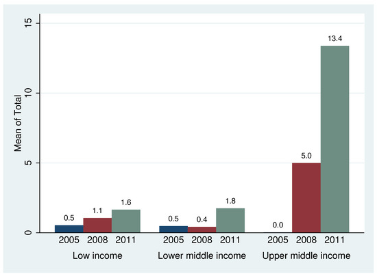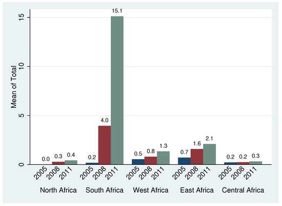 Figure 1 shows the distribution of TOTAL across years and income groups as defined by the World Bank. Microinsurance appears to be more prevalent in upper–middle-income economies, which is driven by the inclusion of South Africa in the censuses of 2008 and 2011 and the explosive growth of microinsurance in Namibia. After excluding these two countries from the sample, the mean of TOTAL exhibits little variation across income groups. However, as Figure 2 illustrates, TOTAL varies substantially across geographic regions (Appendix A lists the countries in the sample by regions). Microinsurance is less prevalent in North and Central Africa compared with the rest of the continent. Although not without its limitations, the dataset collected by the MicroInsurance Centre is unique and unmatched by any other existing source in terms of detail and accuracy. For example, the dataset was used by Biener and Eling (2011) as “representative market data” (p. 94) in comparison with the authors’ sample for consistency.