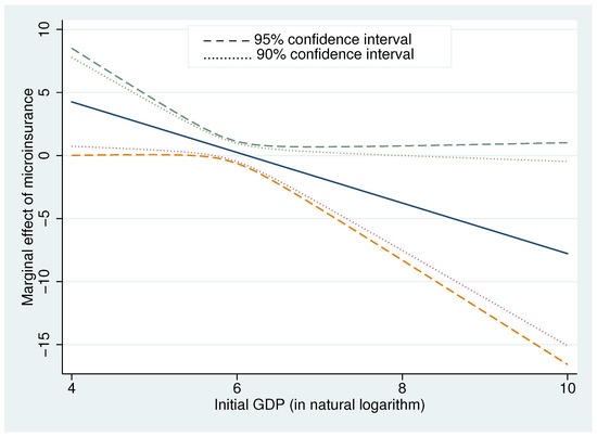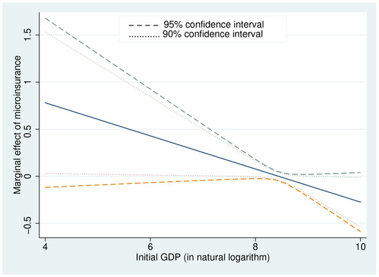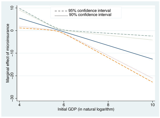 To test for nonlinearities in the microinsurance–growth nexus, a variation in the model is estimated in which both TOTAL and its interaction with INITIAL GDP are included. The results are presented in column (3) of Table 2. The coefficients of TOTAL and its interaction with INITIAL GDP are large in magnitude and statistically significant at conventional levels using both OLS and 2SLS. The low p-value of the difference-in-Hansen test statistic reported at the bottom of column (3) indicates that TOTAL and its interaction with INITIAL GDP cannot be treated as exogenous; therefore, instrumental variable estimates should be relied upon for inference.