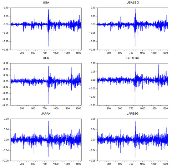 To identify the presence of any asymmetric behavior in the volatility of indices, we observe in EGARCH Table 14 that the λ coefficient of the model is negative and significant for all the indices, which indicates that volatility tends to increase more with negative news in both the broad market indices as well as in ESG indices. This is in line with the existing literature (Fostel and Geanakoplos 2012; Gupta and Chaudhary 2022) that negative news brings more volatility in financial markets, and similar findings are observed in ESG indices across all countries. A larger absolute value of gamma implies a greater degree of asymmetry, meaning that negative shocks have an even greater impact on volatility. In comparing the absolute value of λ coefficient of the broad market with the ESG indices of each country, we observe that in all other countries (other than Germany), the impact of asymmetry was less in the ESG index as compared to the respective market.